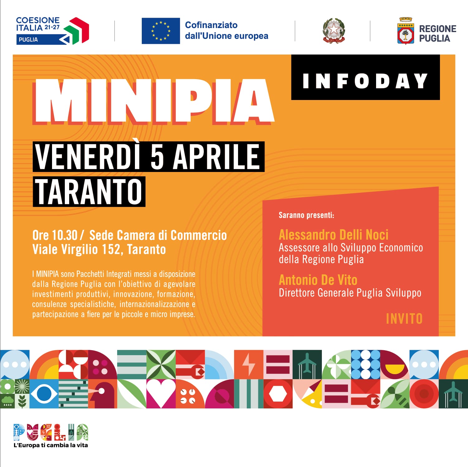 Il 05 aprile 2024, alle ore 10:30, sarà organizzato presso la Camera di Commercio di Taranto un infoday sull’Avviso pubblico “Mini Pia – Pacchetti Integrati di Agevolazione”, messi a disposizione dalla Regione Puglia con l’obiettivo di agevolare investimenti produttivi, innovazione, formazione, consulenze specialistiche, internazionalizzazione e partecipazione a fiere per le piccole e micro imprese.