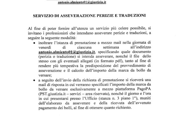 Si pubblica la circolare ricevuta dall’Ufficio del Giudice di Pace di Taranto relativa alla modalità di richiesta di asseverazione perizie e traduzioni.…